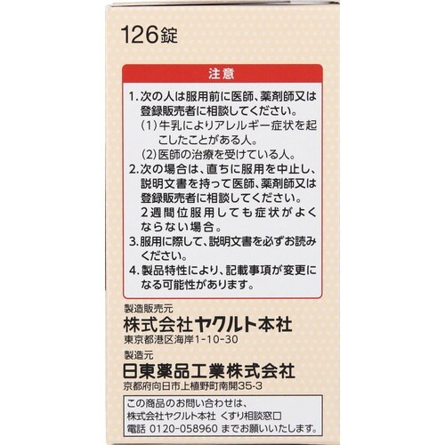 | 注意事項 | ※次の人は服用前に医師、薬剤師又は登録販売者に相談してください。牛乳によるアレルギー症状を起こしたことがある人。医師の治療を受けている人。 |