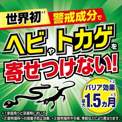 ヘビが天敵に襲われた際に発する警戒臭を利用した有効成分〈オクタン酸〉で、ヘビやトカゲを強力に忌避します。散布場所への居着き防止効果最大1.5カ月持続(散布場所や天候、季節などにより異なります。) |