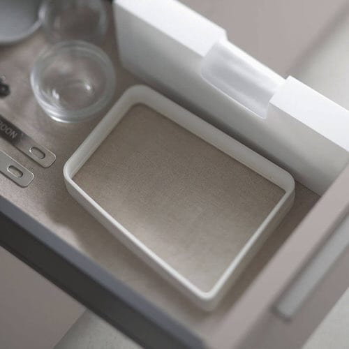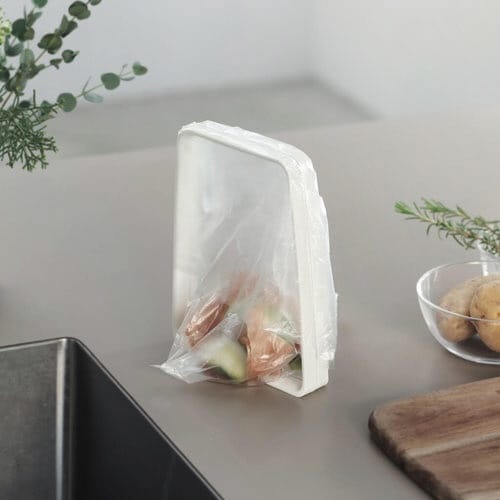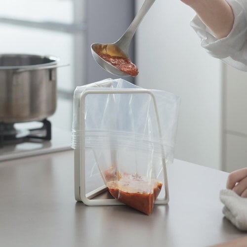 V字に開いて自立する、ポリ袋ホルダーです。セットはポリ袋を奥から手前の順にかけるだけ。袋口が大きく開くのでゴミが捨てやすく、使っていないときは薄く、コンパクトに閉じられます。 |