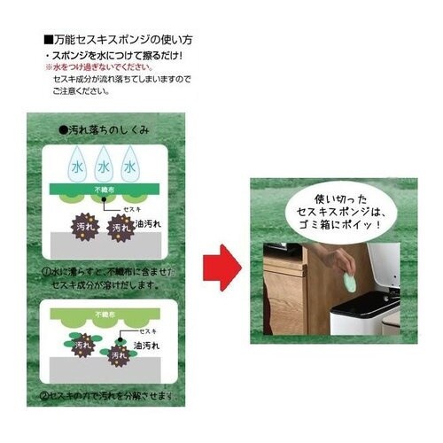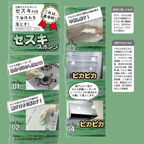 毎日使っても30枚!使い切りで便利です。弱アルカリ性のセスキ炭酸ソーダがレンジフードなどの油汚れを落とします。セスキ成分を含んだ不織布が焦げ付きを落とします。 |