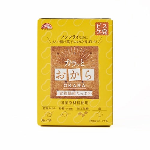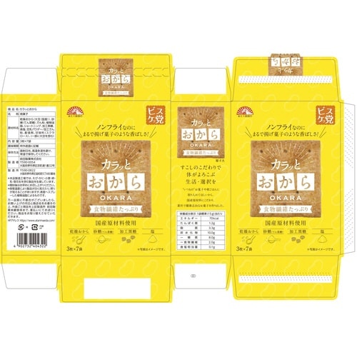 乾燥おから、甜菜糖、黒糖、塩の4品を国産原材料を使用。ノンフライなのに揚げ感があり、大豆のやさしい甘さと風味が特徴な健康志向な焼菓子です。 |