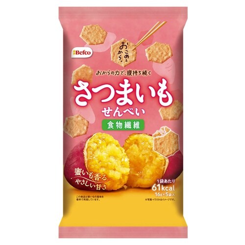 お米のやさしい風味に、パリッと軽やかな食感。おからとさつまいもを使用したほどよい甘さのお煎餅です。 |