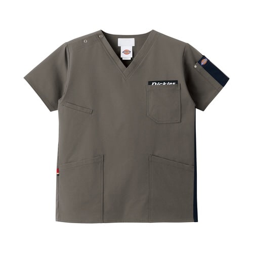 Dickiesロゴテープが映える男女兼用スクラブ。高ストレッチ素材で動きやすく、ポケットも充実。配色ラインがアクセントの多機能デザインです。※左胸刺繍はロゴテープ上対応。 |