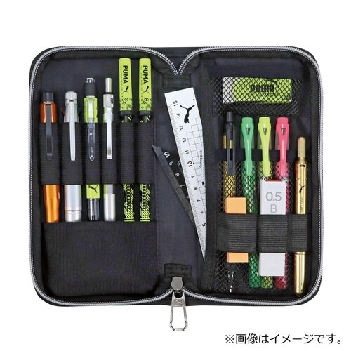 整理しやすく収納物がひと目で分かる。充実のホルダーとポケットで所定の位置に文具を収納可能。本体生地はマット調のコーティング生地。オリジナルデザインの織ネーム、引き手付。メタリックファスナーを使用。 |