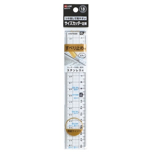 定形サイズにカットできる定規。つや消し加工で反射が少なく見やすい。カッター作業に便利なステンレスとすべり止め付。名刺、写真L版、郵便はがき、A6、B6サイズの目盛り。 |