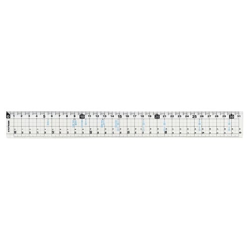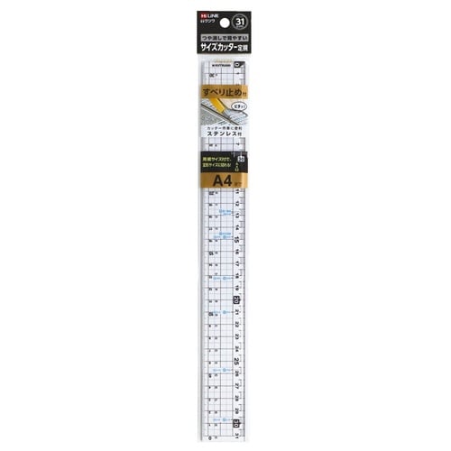 定形サイズにカットできる定規。つや消し加工で反射が少なく見やすい。カッター作業に便利なステンレスとすべり止め付。名刺、写真L版、郵便はがき、A6?A4、B6、B5サイズの目盛り。 |