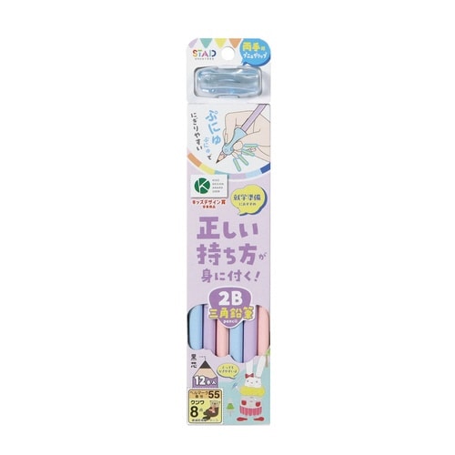両手用プニュグリップ付で正しい持ち方が練習できる。三角軸、2B黒芯、12本入、名前欄付。角が丸くて安全。 |