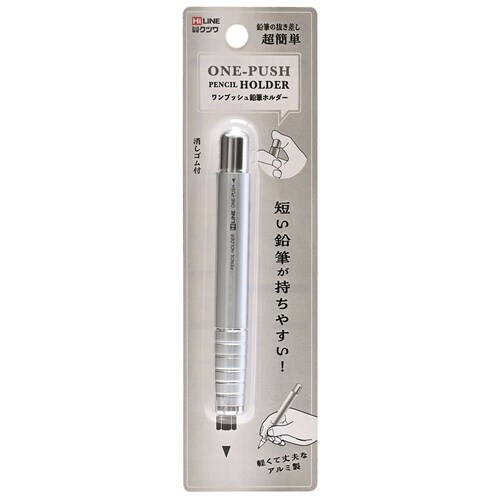 抜き差し簡単ワンプッシュ!ワンプッシュで簡単に鉛筆を着脱。消しゴム付。すべり止め加工。光沢感のあるアルミ製。 |