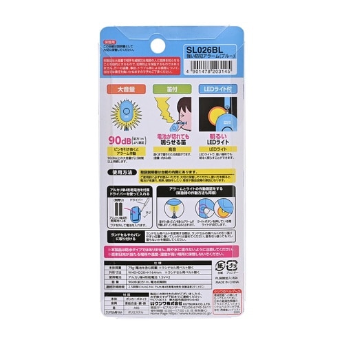 大音量90dB以上が2.5時間以上持続。衝撃に強いプラスチックを使用。ランドセルベルト付・笛付。電池BOX用ミニドライバー付。アルカリ単4形乾電池2本使用(別売)