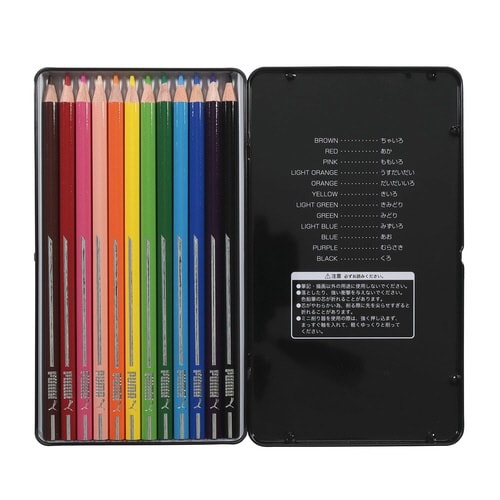 12色、丸軸、缶ケース入。缶ケースに名前欄付。 |