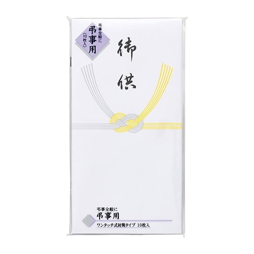 法要・法事などのお供えのかわりとして最適な万円袋(封筒タイプ)、蓮葉のないタイプは宗教問わず使用可能、黄水引は主に中京・関西地方で使用、裏面には封緘が簡単なテープのり付 |