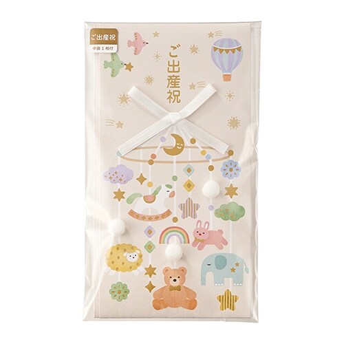 赤ちゃんがご機嫌になる、にぎやかなベッドメリーをモチーフにした出産祝い用のご祝儀袋、マットな箔押加工がお祝いの華やかさを演出 |