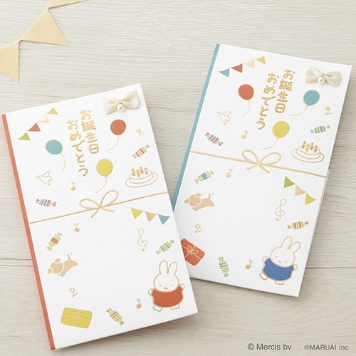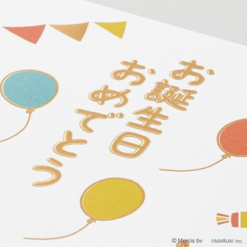 パーティーシーンの楽しい絵柄と箔押しの輝きがお誕生日をにぎやかに彩ります、のし部分にはサテンリボンとパールの飾りつき |