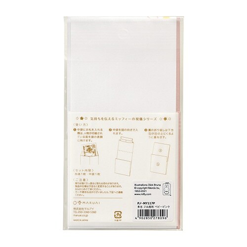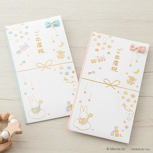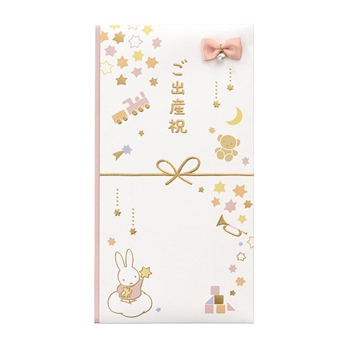 ミッフィーのかわいらしいイラストと箔押しの輝きがお祝いシーンを彩ります、のし部分にはサテンリボンとパールの飾りつき |