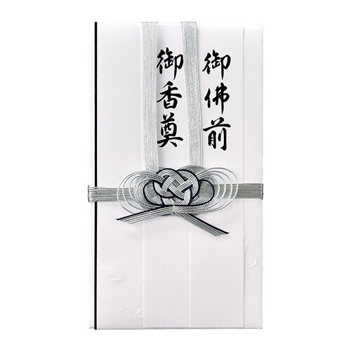 仏式弔事全般の金包みとして最適な金封、金封本体に蓮葉の型押し加工がされ、水引飾りも蓮葉をデザイン |