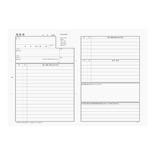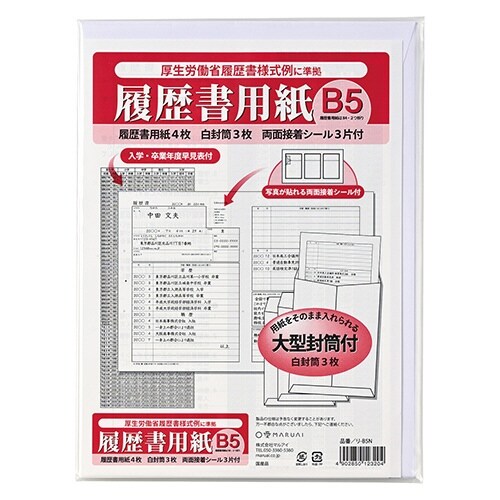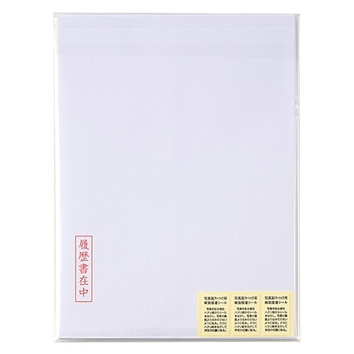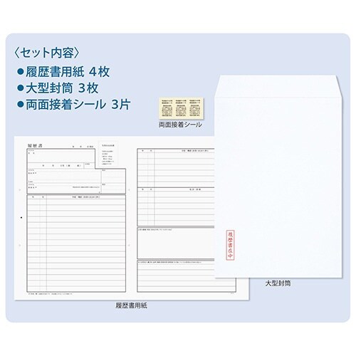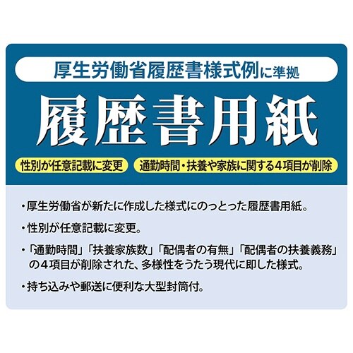 厚生労働省が新たに作成した様式を使用した履歴書用紙B5、セット内容:用紙(B4二つ折り)4枚、角形4号封筒3枚、写真貼付シール3片 |