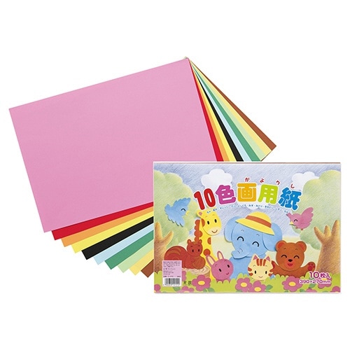 図面、工作、版画、ポスター、台紙、表紙などにあらゆる用途に最適な10色入の画用紙、8ツ切りサイズ、坪量:116.3g/平方m、紙厚:約0.18mm |