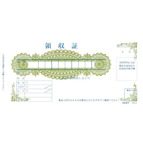 印紙税法別表第1第19号に該当する文書です。1年用2枚複写。領収者は1枚目の領収証控に支払人証控に支払人証印を捺印の上、受領の都度切り取ってください。2枚目の領収証は切り離さず、得意先が保管します。 |