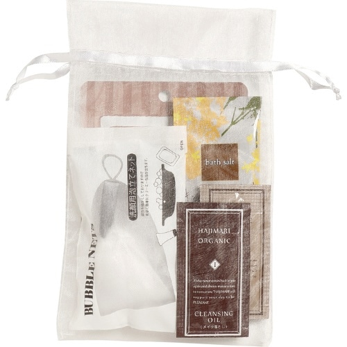 女性用アメ二ティグッズエッセンスマスクパール1、洗顔ネットOP入マット1、SAオーガニックバスソルト3種アソート1、ハジマリオーガニック(クレンジング、洗顔料)各1、オーガンジーバッグ白1 |