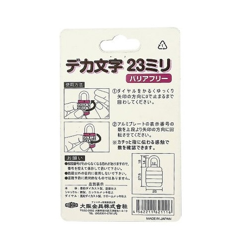 0ストップ機構なので、夜間でも使用しやすい。文字が大きく、ハッキリとよく見えるので、番号があわせやすい。10角なので、廻しやすく止めやすい。 |