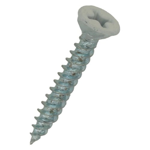 材質は鉄でユニクロめっき。フレキ付きのビス。下穴不要で薄鉄板にすばやく打ち込むことができます。 頭部に白色の塗装が施されています。1.2mmまでの薄鉄板の軽鉄施工。 |