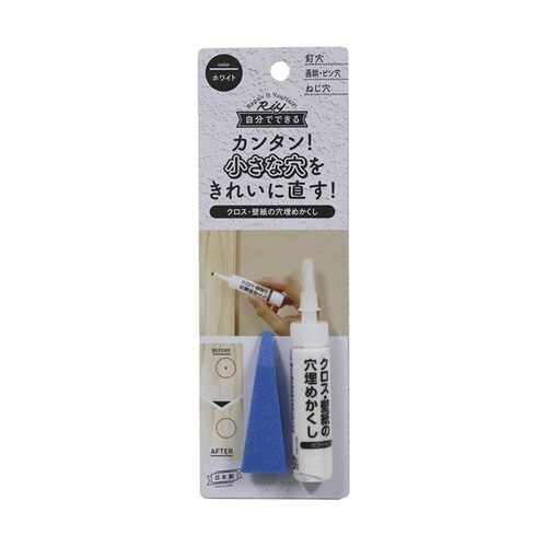 クロスや壁、柱の釘穴、ピン穴、ネジの抜き穴をきれいに直します。穴に注入したら余分な部分を取り除き付属のへらでならすだけです。 |