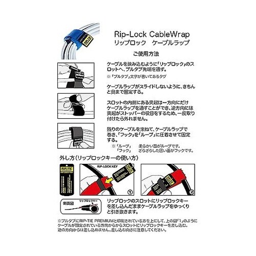 効率的なケーブル管理を実現するリップロックケーブルラップ。ケーブルへの取り付け方はプルタブを後端のスロット穴に通すだけ。スロット内部の特殊な構造でしっかり固定され外れません。 |