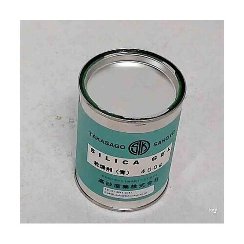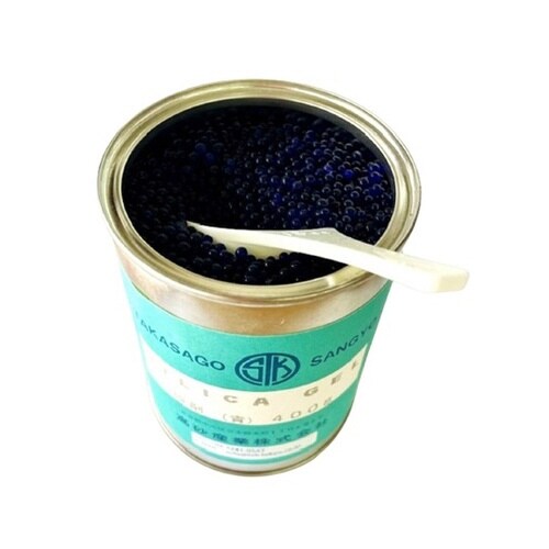 青色のA型シリカゲル塩化コバルトを含有しないノンコバルト品です。吸湿すると赤紫色に変わります。シリカゲルをすくうためのスプーン付きです。 |
