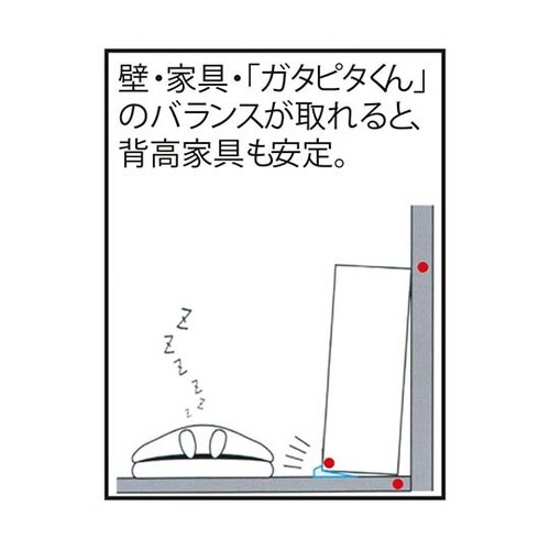 家具の下に「ガタピタくん」を設置することにより、家具の重心が後ろに移り転倒しにくくなります。エラストマー樹脂の為、微弱な振動を吸収します。 |