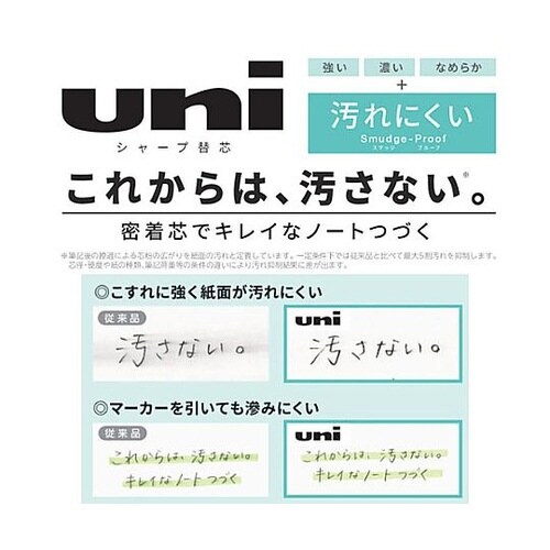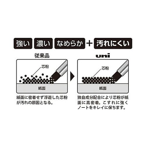 こすれに強くノートをキレイに保つ密着芯デザイン性と機能性を兼ね備えたスライド式ケースで芯が取り出しやすいくっきり濃いのに汚れにくい 独自成分配合により芯粉が紙面に高密着。 |