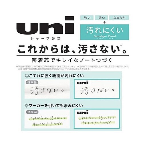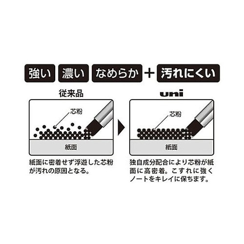 くっきり濃いのに汚れにくい 独自成分配合により芯粉が紙面に高密着。くっきり濃い文字を書くことができ、かつ、こすれに強いため筆記後のノートをキレイに保ちます。 |