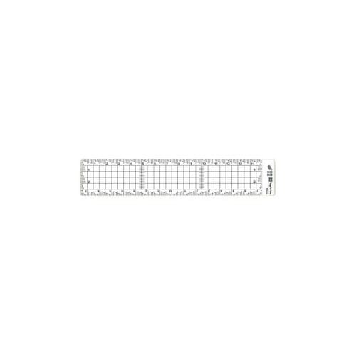 測定や線引き作業に。1mm単位の目盛が見やすく、数値を瞬時に把握できる連続追数字表示+2mm点付の階段状目盛です。背面側は左右振り分けに便利な中央基点目盛です。 |