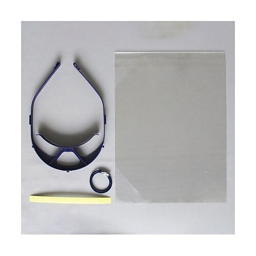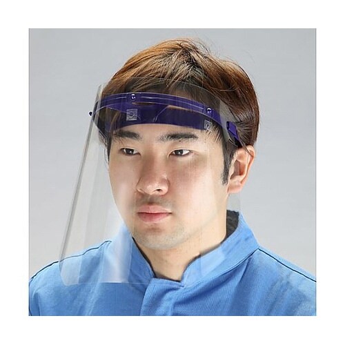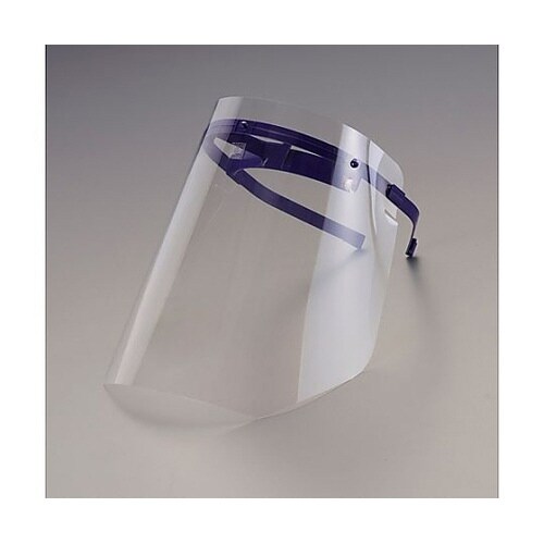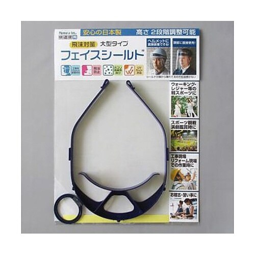 飛沫防止やホコリ・飛来物除けに役立つ日本製フェイスシールドです。くもり止め加工、UVカット、工事用ヘルメットへの装着にも対応。頭部に固定するフェイスシールドです。 |