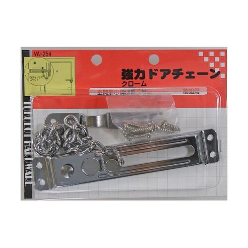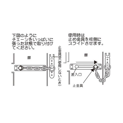 扉を少し開いた状態で訪問者に対応できるので、防犯に適しています。玄関扉の補助締りに。取り付けの際、木部の割れやビスの破損を防ぐためキリで下穴を開けてください。 |