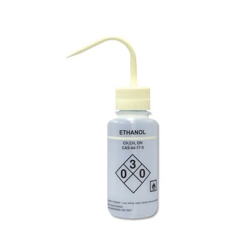 自己通風タイプの薬品識別洗浄瓶でノズルからの液だれを防止します。CAS番号・NFPA表記がプリントされています。 |