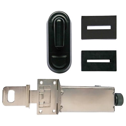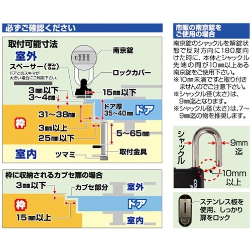 カブセ扉にキズを付けずに後付でき、南京錠で施錠できる金具です。 |