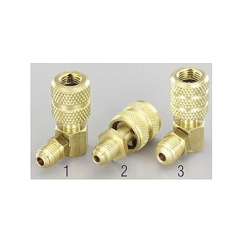 メスねじ側がクイックシールタイプになっております。チャージングホース先端に取り付けることで冷媒の吹き出し防止になります。 |