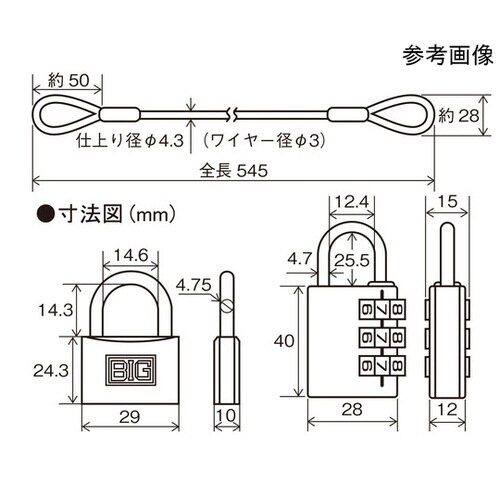 高強度スチールワイヤー使用です。対象物をキズつけにくいビニールコーティングです。両端アイ加工のワイヤーロープと南京錠のセット品です。 |