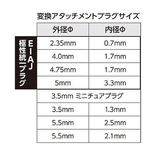 変換プラグ8個付(極性統一形4個)CDラジカセ、ヘッドフォンステレオ、ラジオ等に対応乾電池使用製品(CDジャック付)が家庭用コンセントで使える。 |