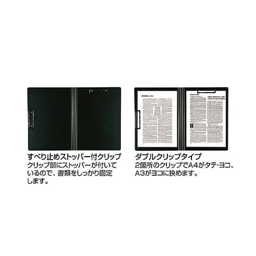 A4縦、横(ダブルクリップタイプ)再生発泡PP製2.5mm厚表紙が360°折り返せるので立ったままの筆記でも書き込みやすい。見開きにも使え、A3・B4サイズの書類もはさめます。 |