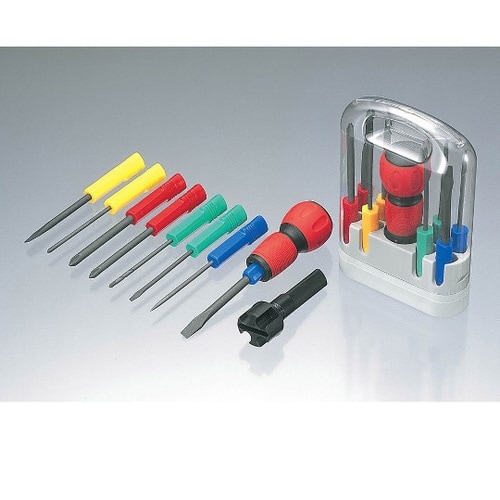 握りやすいボールグリップハンドル付のドライバーセット。セット内容もスタンダードな8本組タイプ。ヒートン回しもついています。収納に便利なケース付です。 |