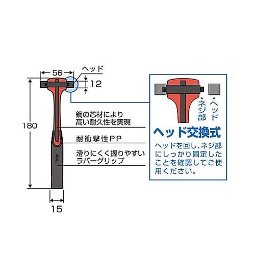 鋼の芯材により、木柄の3倍の耐久性を実現本体は耐衝撃性プラスチックの一体成型。 |