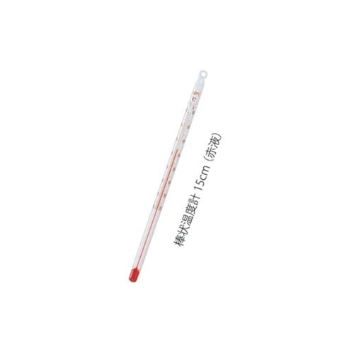 全長150mmの短いガラス温度計です。上部にはひもなどを通す穴が開いております。 |