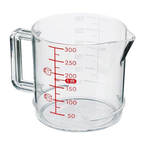 300mlまで量ることが出来る計量カップです。前後2か所に目盛りがついております。持ち手と注ぎ口がついてるので注ぎやすくなっています。 |
