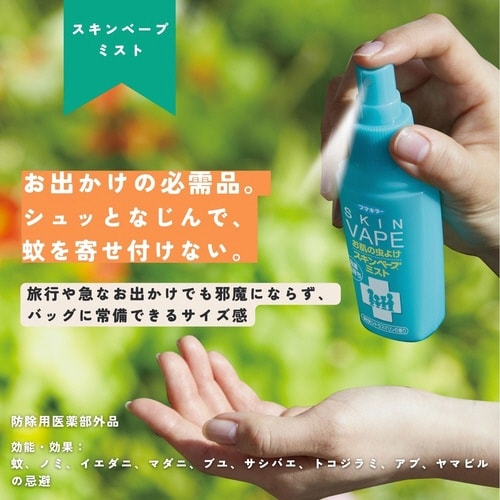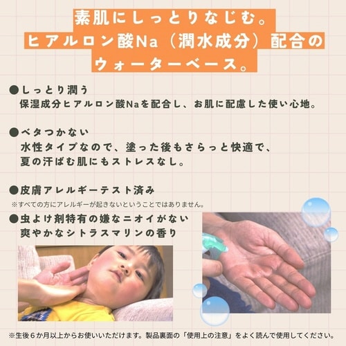 蚊はもちろん、マダニやトコジラミ、ノミ、イエダニ、ブユ、サシバエ、アブ、ヤマビルにも優れた効果を発揮します。虫よけ成分を10%配合しているので、効果が長時間持続します。お肌にやさしい使い心地。 |