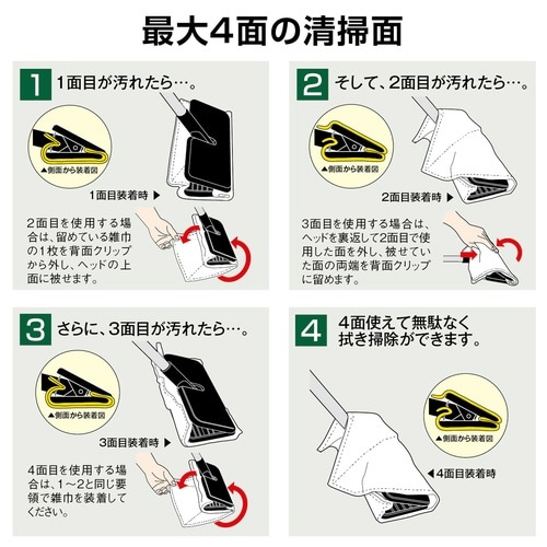 床だけでなく天井や壁の拭き掃除など、マルチに使える雑巾モップ専用の替雑巾。最大4面の清掃面が使用でき、お掃除の効率が上がります。 |