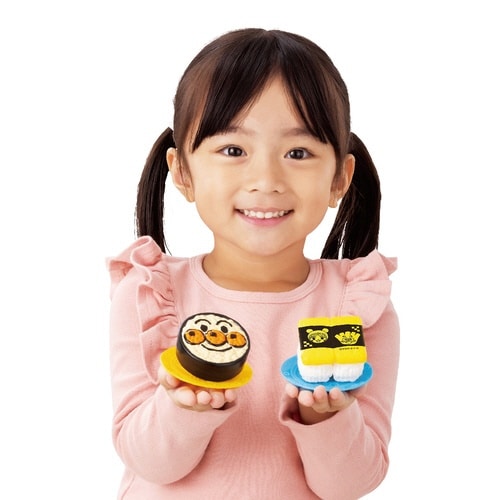 スマートタッチパネルで注文、くるくる回るアンパンマンの回転ずし!食べ終わったお皿を返却口に入れるとルーレット遊びが楽しめるよ!後ろの棚におすしのネタやシャリを置いて、おすしをにぎろう! |