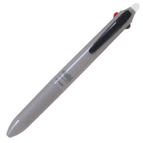 「こすると消える」フリクションインク(黒・赤・青3色)と「消えない」油性インク(黒色)を1本に収めた筆記具です。 |