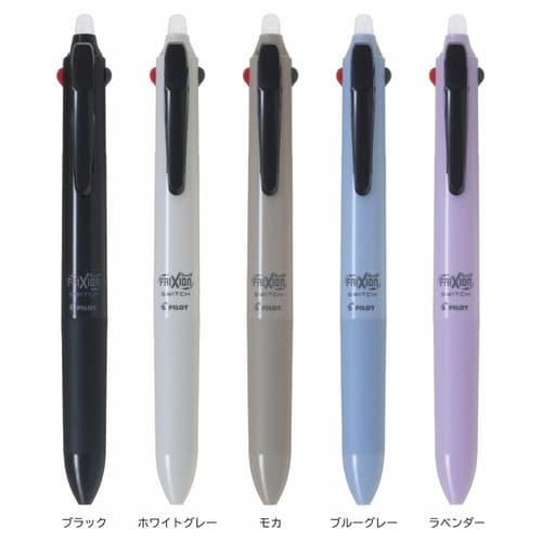 | 注意事項 | ※黒・赤・青のスライドレバーの芯はペン上部のラバーでこすると色が消えるフリクションインキです。証書類・宛名など消えてはいけないものに使用しないでください。高温下に置かないでください。フリクションインキは60℃以上になると筆跡が無色になります。感熱紙など紙の種類や、印刷物の特性によっては消去に不向きな場合があります。クリップスライドレバーの芯はこすっても消えない油性インキです。 |
