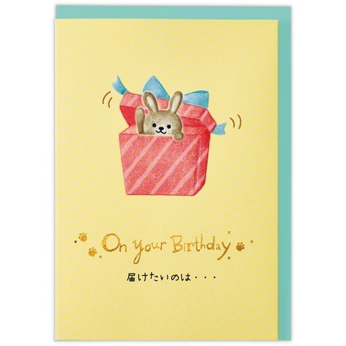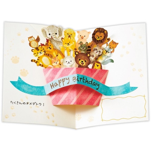 動物たちからたくさんのおめでとう!シンプルな表紙を開くと、プレゼントボックスに入った動物たちがワッとポップアップする楽しいバースデーカード。キュートな動物たちがたくさん描かれています。 |